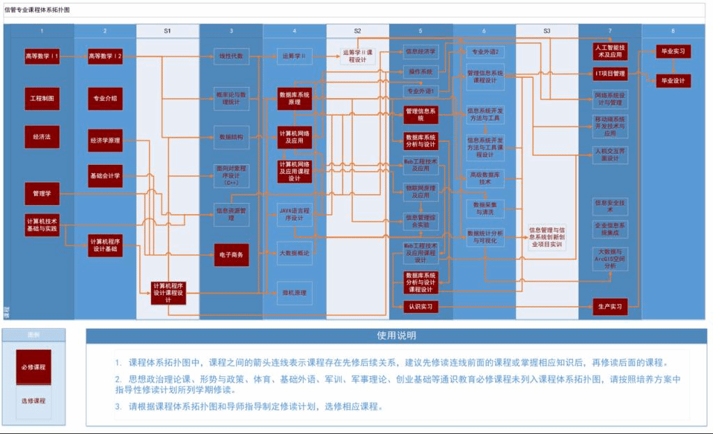 本专业开设信息系统设计与开发方向和大数据管理与应用方向,课程体系拓扑见下图: