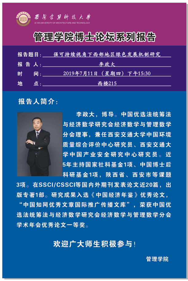 7月11日下午15:30西楼215会议室,博士论坛雷竞技RAYBET分论坛系列报告之一:强可持续视角下西部地区绿色发展机制研究,报告人:李政大,欢迎广大师生积极参加!