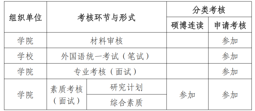 考核形式为面试,考核内容包括研究计划、综合素质两个部分。考核时间原则上不得少于20分钟(不含研究计划PPT汇报时间)。