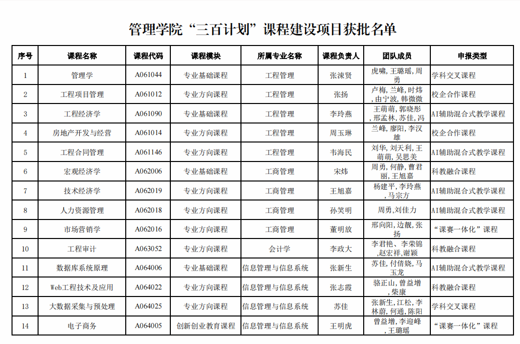 本科生院“三百计划”课程建设项目立项结果揭晓,我院共计14门课程获得立项。具体结果如下: