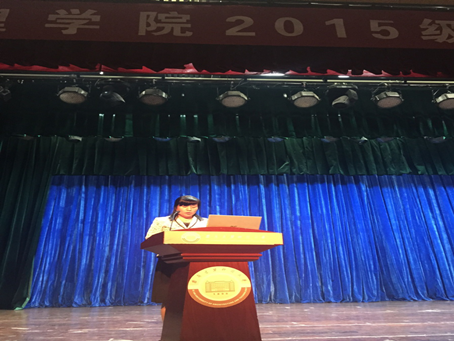 大会第四项,由2015级新生代表工商管理专业魏玺宸同学发言,他认为,面对崭新的生活学习环境,要以积极的心态和饱满的热情面对即将到来的大学生活,不仅要学好专业知识,更要积极投身到丰富多彩的校园生活中,充实自己,完善自己,提升自己。