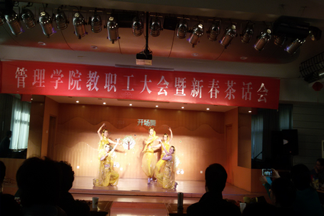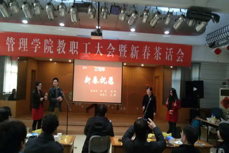 本次茶话会本着交流、分享的目的,所有节目都由学院各教研室、机关教师独立创作完成,既有展现青春活力的舞蹈《天竺少女》,亦有表达新春祝福的三句半《新春祝愿》,工程管理教研室徐勇戈老师一首《鸿雁》更是引得阵阵欢呼,公共事业管理教研室金青梅老师颇具创新的《老歌新唱》更是表达了自己对学院的感谢之情,会计学教研室的美女老师们也带领大家重温了神曲舞蹈《小苹果》,公共事业管理教研室杨朔老师独唱《鬼迷心窍》,工商管理教研室带来的热剧配音串烧《小龙女之保肾心经》更是大开眼界、爆笑如雷。学生工作办公室全体辅导员老师自编自导的说唱《去哪儿》,国际经济与贸易教研室风趣幽默的配乐诗朗诵《我的滑板鞋》更是将茶话会推向高潮。