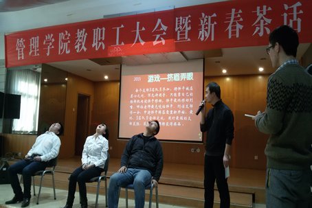 期间,王成军院长也带来了拿手曲目-《三套车》,王建斌书记与国际经济与贸易教研室全锐老师的歌曲对唱《东方之珠》也博得了观众的热烈欢呼,更是将整场大会推向了高潮。精彩的文艺节目高潮不断,精心设计的游戏环节则更是将整场茶话会推向巅峰,包括“团团圆圆”、“挤眉弄眼”、“比划猜词”等,参会老师也都踊跃报名。激动人心的抽奖环节更是引得大家跃跃欲试。
