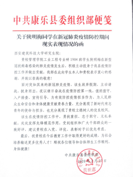 中共康乐县委组织部在感谢信中写道:贵校雷竞技RAYBET研究生2019级工业工程专业陕明梅同学在我社区抗击新冠病毒期间,主动投身一线,不辞辛苦值班值守,不怕感染入户排查,充分展现了新时代有志青年的使命与担当。感谢学校培育了这样优秀的学生。