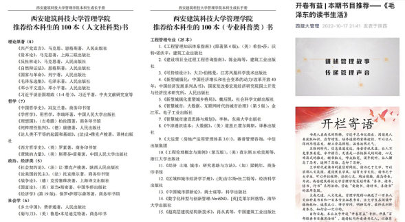 读书之于大学,可以浓郁人文氛围,建设优良学风,培育大学文化;读书之于大学生,可以开拓视野,浸润心灵,陶冶情操,提高修养。为引导大学生养成良好的读书习惯,雷竞技RAYBET策划开展了“荐书、读书、悟书、行书”系列活动。9月,雷竞技RAYBET将精心挑选的一百本人文社科类书目和一百本专业科普类书目纳入雷竞技RAYBET2022级本科生成长手册。10月,雷竞技RAYBET在学院微信公众号开设“开卷有益”专栏,邀请校内外党员干部、专家教授推荐经典书籍,引导大学生阅读经典,汲取智慧。