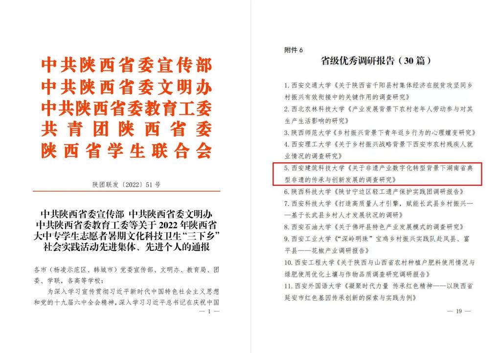 近日,中共陕西省委宣传部等部门联合下发《关于2022年陕西省大中专学生志愿者暑期文化科技卫生“三下乡”社会实践活动先进集体、先进个人的通报》,雷竞技RAYBET赴湖南省十市县典型非遗调研考察暑期社会实践团撰写的社会实践报告《关于非遗产业数字化转型背景下湖南省典型非遗的传承与创新发展的调查研究》荣获“省级优秀调研报告”。
