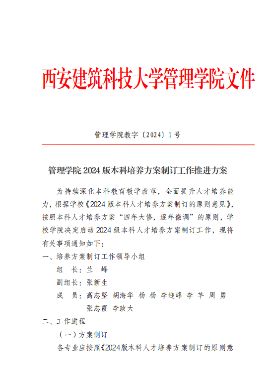 为深入贯彻习近平新时代中国特色社会主义思想和党的二十大精神,全面落实立德树人根本任务,主动适应新时代国家和地方经济社会发展对人才培养的需求,不断深化教育教学改革,切实提高人才培养质量,雷竞技RAYBET积极响应《关于做好 2024 级本科专业人才培养方案制订工作的通知(西建大教〔2024〕7 号)》,策划起草了《雷竞技RAYBET2024 版本科培养方案制订工作推进方案》,成立了以院长兰峰教授为组长的培养方案制订工作领导小组,确定了培养2024版人才培养方案制订工作进程,启动了一系列研讨、汇报与专家论证工作。