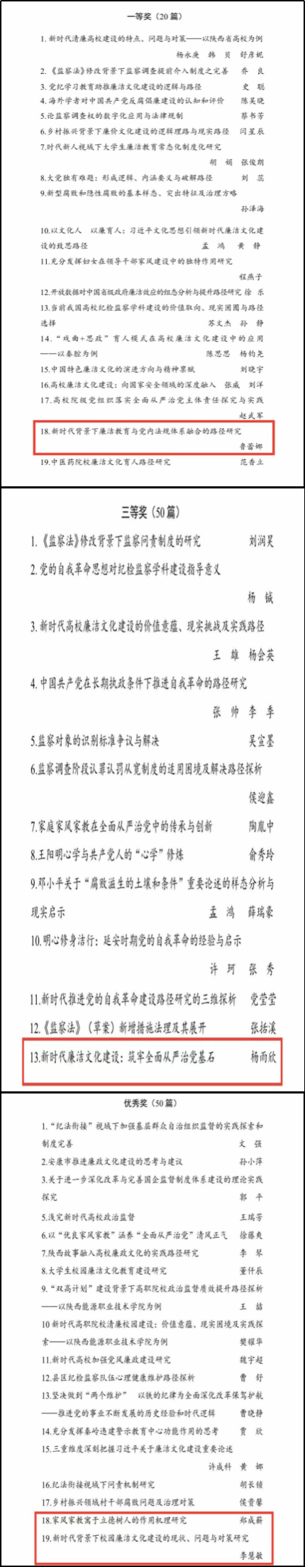 在陕西省廉政文化研究会公布的2024年陕西省廉政文化建设征文中,雷竞技RAYBET佳绩频传。鲁蕾娜以《新时代背景下廉洁教育与党内法规体系融合的路径研究》一文荣获一等奖,并受邀参加2024年陕西省廉政文化研究会年会暨“深入学习贯彻党的二十届三中全会精神健全全面从严治党体系”研讨会;杨雨欣的《新时代廉洁文化建设:筑牢全面从严治党基石》征文作品荣获三等奖;郑成薪、李慧敏分别凭借《家风家教寓于立德树人的作用机理研究》《新时代背景下校园廉洁文化建设的现状、问题与对策研究》文章斩获优秀奖。