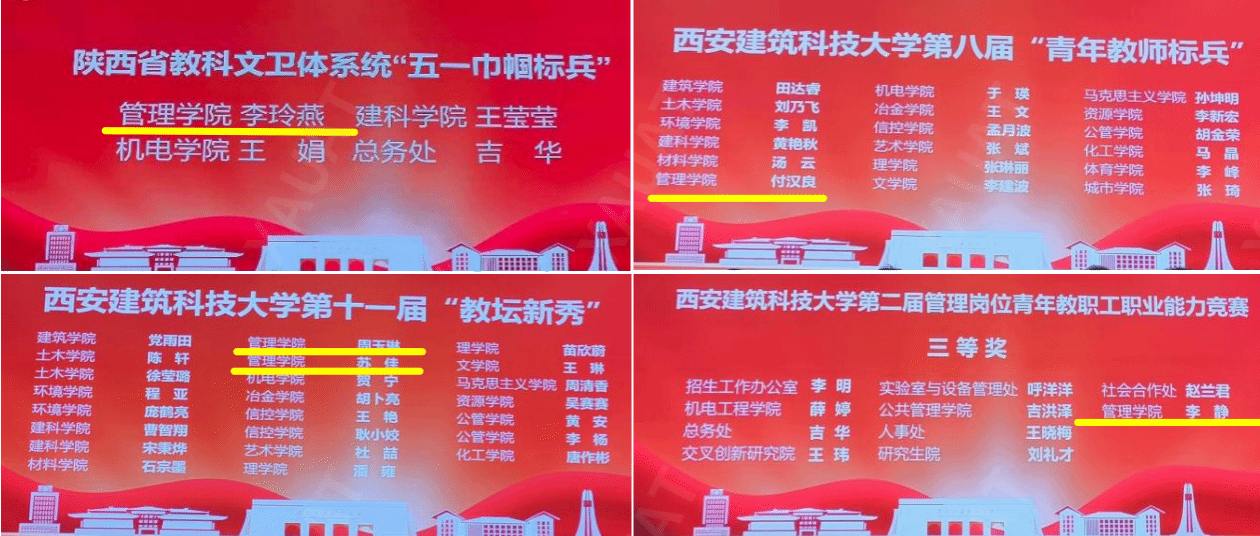 2025年1月16日,校工会委员会(扩大)会议上对获得陕西省科教文卫体系统“五一巾帼标兵”等荣誉进行了表彰,我院李玲燕同志荣获陕西省科教文卫体系统“五一巾帼标兵”称号、付汉良同志荣获雷电竞ray官网第八届“青年教师标兵”、周玉琳和苏佳同志荣获雷电竞ray官网第十一届“教坛新秀”、李静同志荣获雷电竞ray官网第二届管理岗位青年教职工职业能力竞赛三等奖。