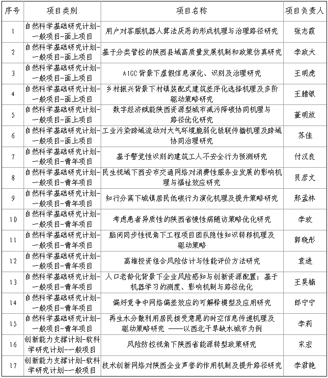 近日,陕西省科学技术厅公布了2025年度陕西省科技发展计划项目资助结果,我院获批各类项目共17项,实现历史性突破。其中,面上项目6项、青年项目9项、软科学研究计划项目2项。获准项目数量较上年度增长了112.5%,在全校各学院中位列第三。