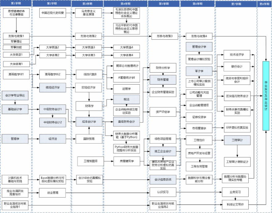会计学专业核心课程包括基础会计学、中级财务会计、高级财务会计、成本会计学、财务管理、会计信息系统、管理会计学、审计学、施工企业会计、工程审计等主要课程。