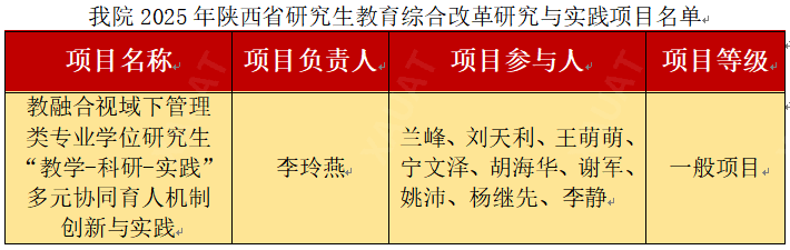 近日,陕西省教育厅、陕西省学位委员会联合公布2025年陕西省研究生教育综合改革研究与实践项目立项结果,我院李玲燕教授牵头申报的《产教融合视域下管理类专业学位研究生“教学-科研-实践”多元协同育人机制创新与实践》项目成功获批。