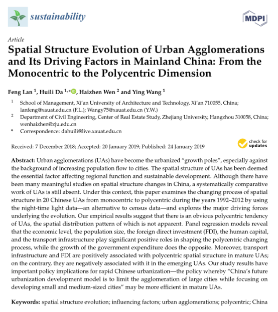 近日,我院兰峰教授团队在环境科学与生态学领域国际SSCI期刊《sustainability》,发表题为《Spatial Structure Evolution of Urban Agglomerations and Its Driving Factors in Mainland China: From the Monocentric to the Polycentric Dimension》的研究成果。