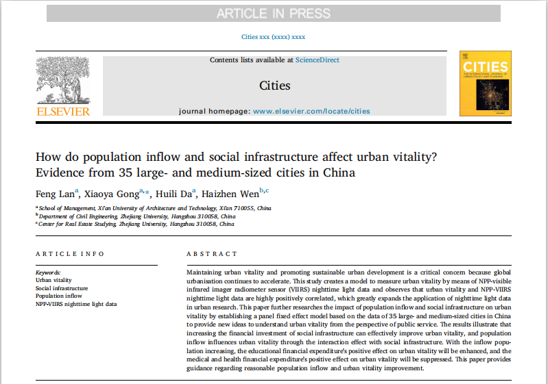 近日,我院兰峰教授课题组在Urban Studies领域国际著名期刊《Cities》发表题为“How do population inflow and social infrastructure affect urban vitality? evidence from 35 large- and medium-sized cities in China”的研究成果。《Cities》期刊全名为《Cities: The International Journal of Urban Policy and Planning》(城市:城市政策与规划国际杂志),是Thomson Reuters(汤森路透)收录SSCI期刊,当前其影响因子4.299和综合排名在全球所有134个城市研究类(Urban Studies)SSCI期刊中名列第二。这是我院首次以第一作者和通讯者身份在城市研究A类SSCI期刊上发表论文。