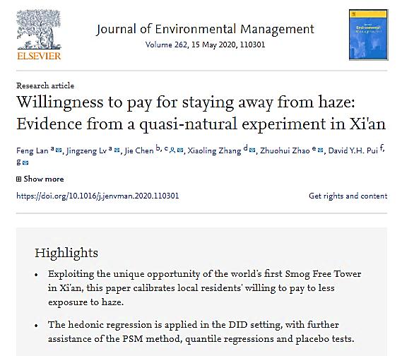 近日,我院兰峰教授课题组在ENVIRONMENTAL SCIENCE领域国际知名期刊《Journal of Environmental Management》发表题为“Willingness to pay for staying away from haze: evidence from a quasi-natural experiment in Xi’an”的研究成果。《Journal of Environmental Management》 (环境管理杂志)是Thomson Reuters(汤森路透)收录SCI一区期刊,当前影响因子4.865。