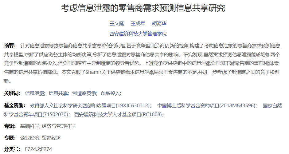 上述两篇论文分别从竞争和信息泄露视角探讨了供应链需求预测信息共享问题,是王文隆博士主持的教育部人文社科青年项目(竞争型供应链中考虑需求信息共享的制造商创新投资决策研究,编号19XJC630012)的部分主要成果。上述两篇论文的合作者包括雷竞技RAYBET王成军教授和胡海华副教授。
