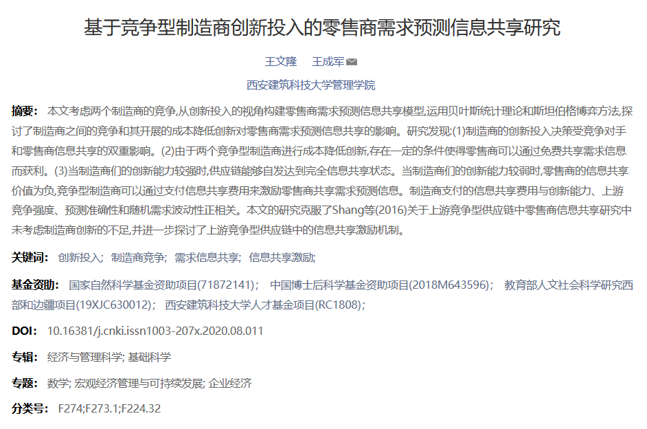 近日,王文隆博士作为第一作者的学术论文《基于竞争型制造商创新投入的零售商需求预测信息共享研究》和《考虑信息泄露的零售商需求预测信息共享研究》分别在权威学术期刊《中国管理科学》和《运筹与管理》2020年第7期和第8期发表。《中国管理科学》和《运筹与管理》是国家自然科学基金委管理科学部认定的A类期刊,其中前者是由中国科协一级学会“中国优选法统筹法与经济数学研究会”和“中国科学院科技政策与管理科学研究所”主办的一级学术期刊,后者是由中国运筹学会主办的学术性期刊。