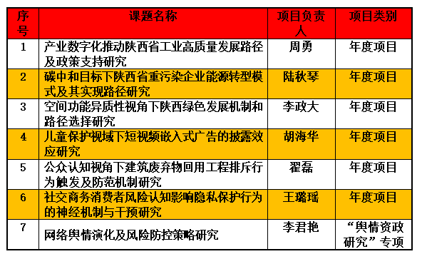 近日,陕西省哲学社会科学规划办公室公布了2021年度省社科基金项目的立项结果,我院共获准7项,其中周勇、陆秋琴、李政大、胡海华、翟磊和王璐瑶6位老师主持的年度项目获得立项;李君艳老师主持的省社科“舆情资政研究”专项项目获得立项。今年我院共申报19项,其中年度项目17项,立项率为35%;“舆情资政研究”2项,立项率为50%。