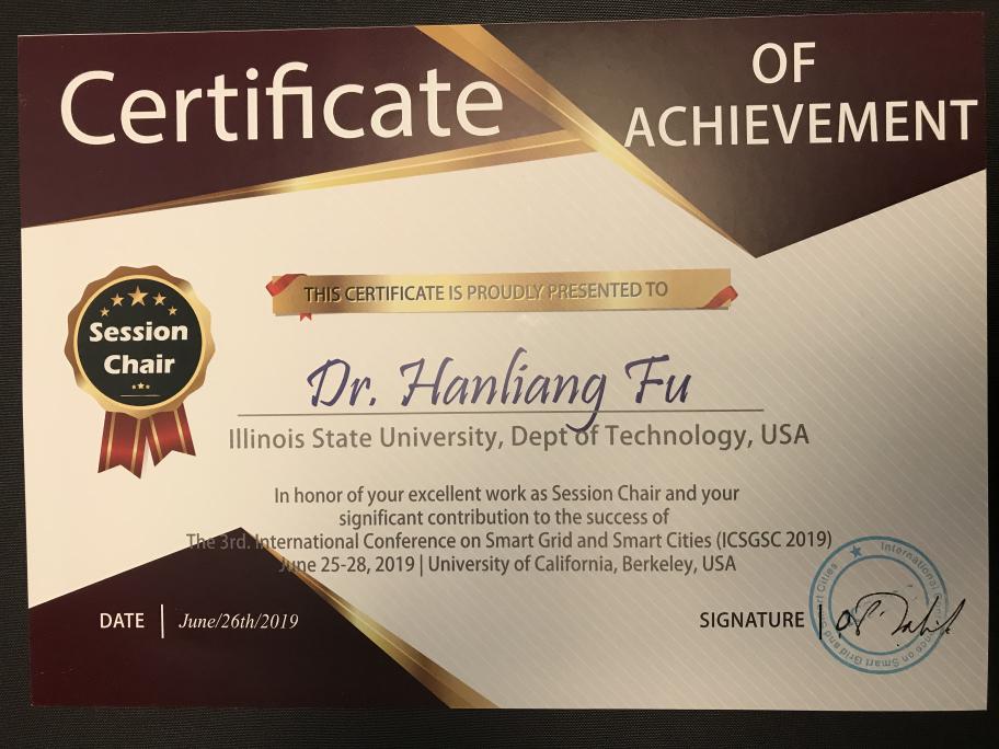 2019年6月25日至28日,我院师资博士后付汉良受邀赴加州大学伯克利分校(UC Berkeley)出席第三届智慧城市及智能电网国际会议(ICSGSC 2019)暨第二届能源、电气及电力工程国际会议(CEEPE 2019),并担任“Energy System”主题分会场主席。