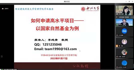 2022年1月17日下午,西北大学李纯青教授为雷竞技RAYBET师生作了题为《如何申请高水平项目——以国家自然基金为例》的学术报告。报告由周勇教授主持,雷竞技RAYBET约300名师生通过腾讯会议在线聆听了本次报告。