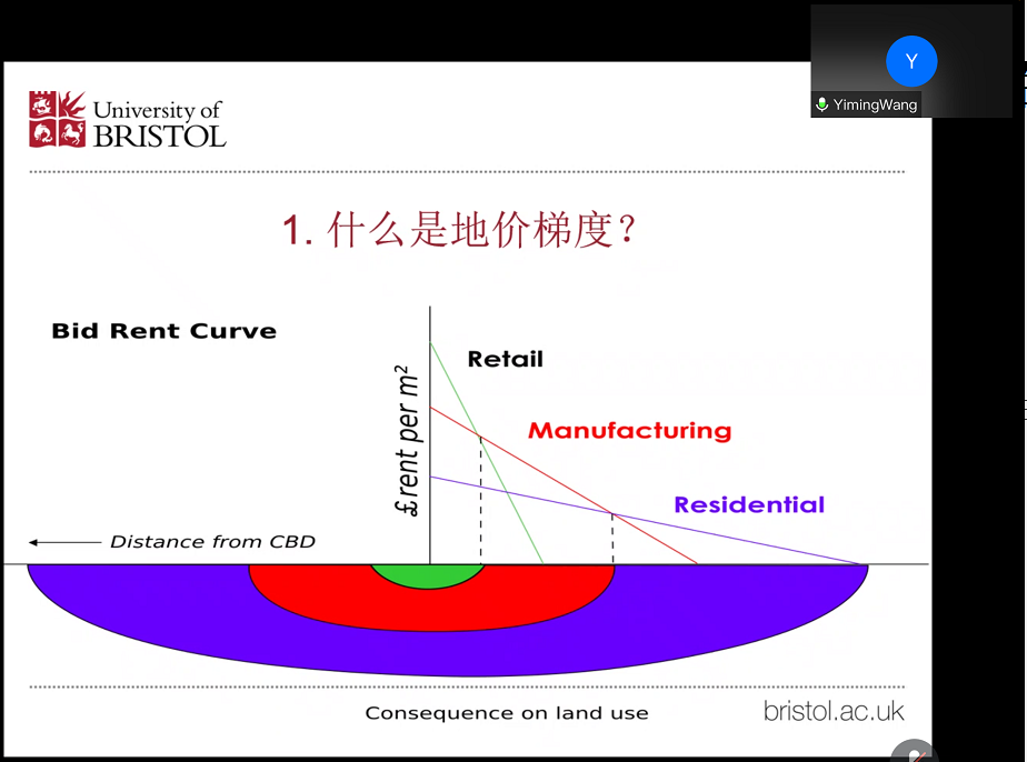 讲座开始,汪轶溟副教授由杜能模型深入浅出地引入地价梯度的概念,详细介绍了零售业、制造业、居住社区的竞租曲线以及土地供给零弹性与地租理论,从而引出关于地价梯度与空间结构之间关系的思考。