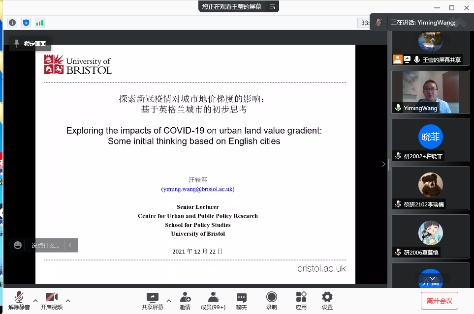 2021年12月22日下午,英国布里斯托大学终身教职汪轶溟副教授为雷竞技RAYBET师生作学术讲座:《关于探索新冠疫情对城市地价梯度的影响:基于英格兰城市的初步思考》。讲座由兰峰教授和王莹副教授主持,雷竞技RAYBET约320名师生线上聆听了本次报告。