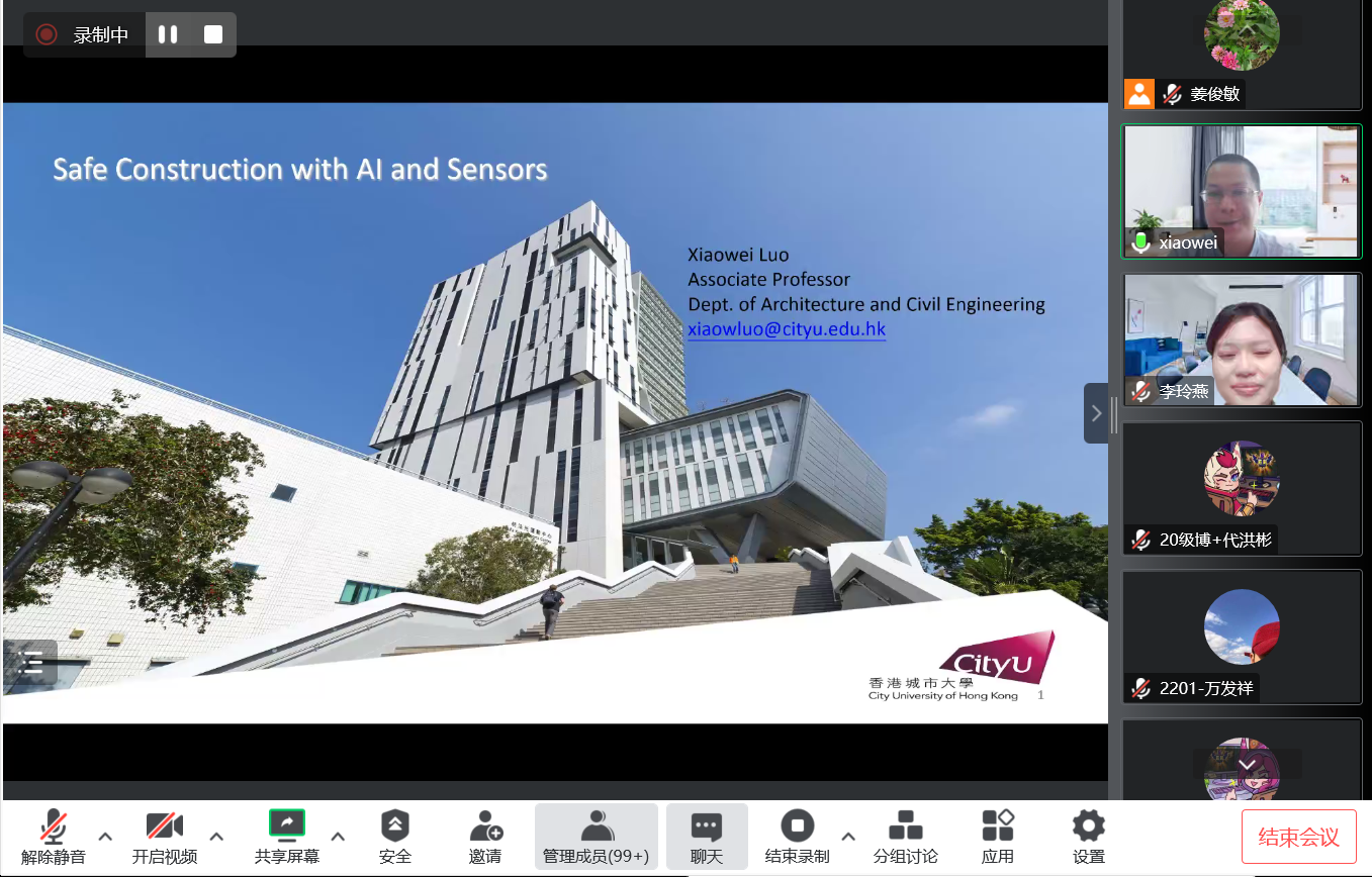 为做好学术交流工作,进一步提高我院师生的研究质量。2022年12月27日,我院特邀香港城市大学建筑及土木系副教授、博士生导师骆晓伟为我院师生作了题为“Safe Construction with AI and Sensors”的学术讲座。会议由副院长李玲燕教授主持,我院约200名师生参加。