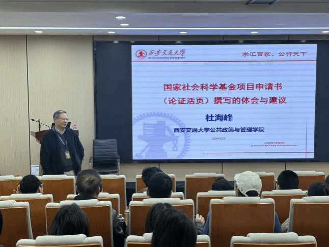 2024年12月3日,西安交通大学杜海峰教授应邀在雁塔校区主楼440报告厅为我院师生们带来了一场题为《国家社会科学基金项目申请书(论证活页)撰写的体会与建议》的精彩报告。本次报告由雷竞技RAYBET副院长李玲燕教授主持,我院100余名师生聆听了报告。