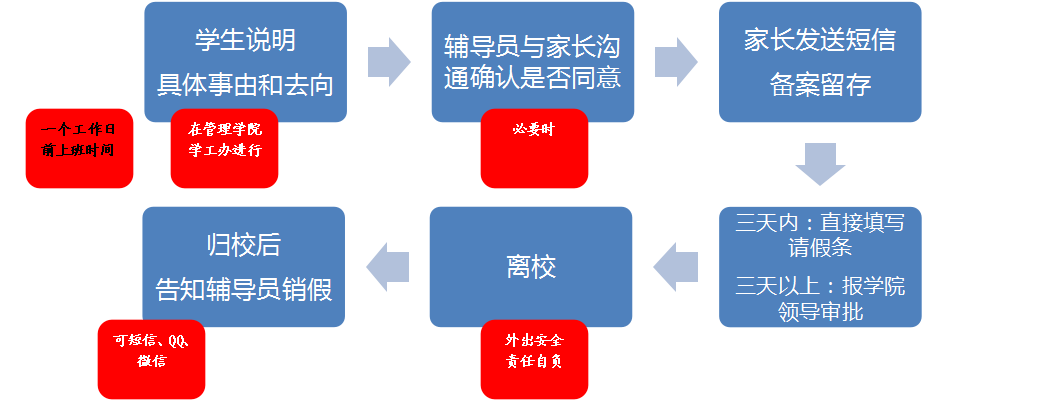 请假时应说明具体的事由和地点,并由家长向辅导员手机发送短信说明相关情况(必要时家长与辅导员应直接通话沟通),家长同意后方可继续填写请假手续。